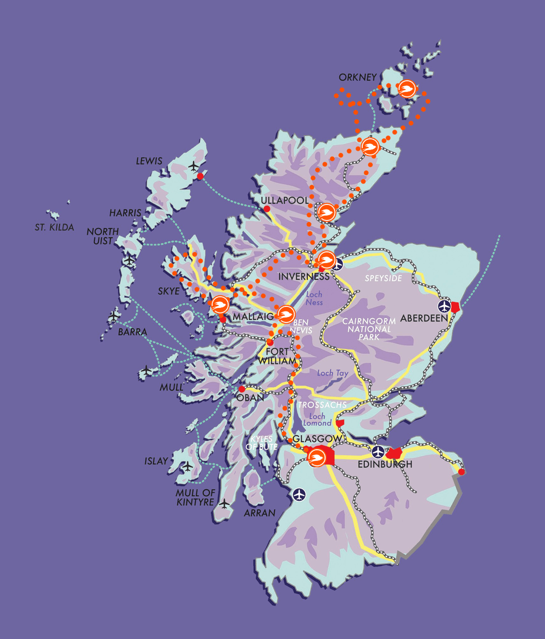 The tour begins with an overnight stay in Glasgow, followed by two nights in Fort Augustus on the southern shores of Loch Ness, two nights on the Isle of Skye, three nights in Inverness, two nights in Caithness, two nights in Orkney before concluding with a final night in Dornoch en route back to Inverness.