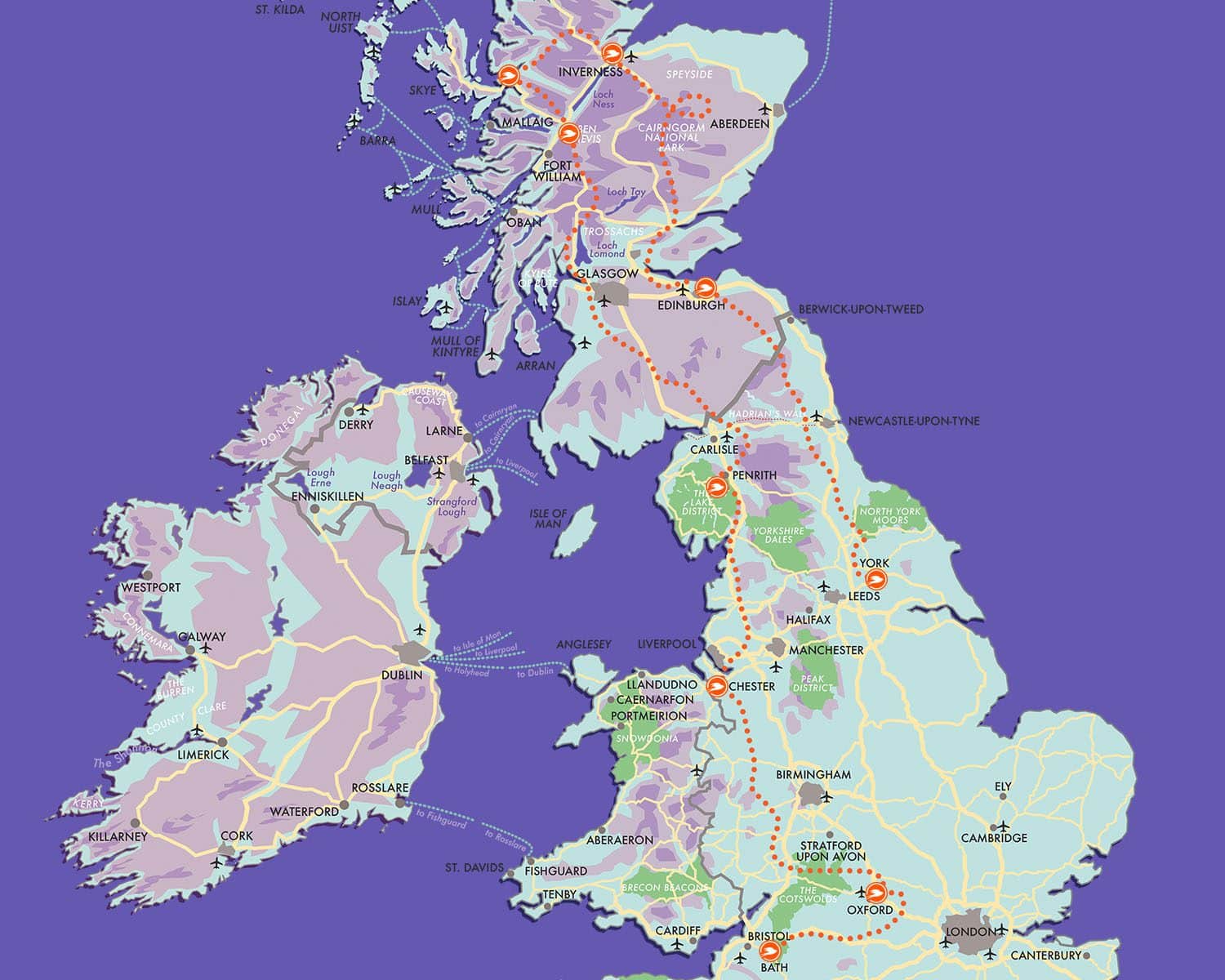 Two nights in Bath, two in Oxford, one in Chester, two in the Lake District, one in Spean Bridge, one in Plockton, two in Inverness, two in Edinburgh, and two nights in York.