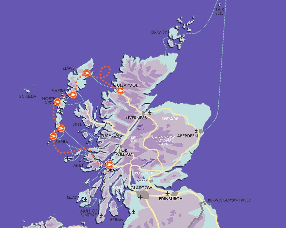 Experience the outlying islands of Barra, Vatersay, Eriskay, the Uists, Benbecula, Berneray, Harris, Scalpay and Lewis, at a supremely relaxed pace.